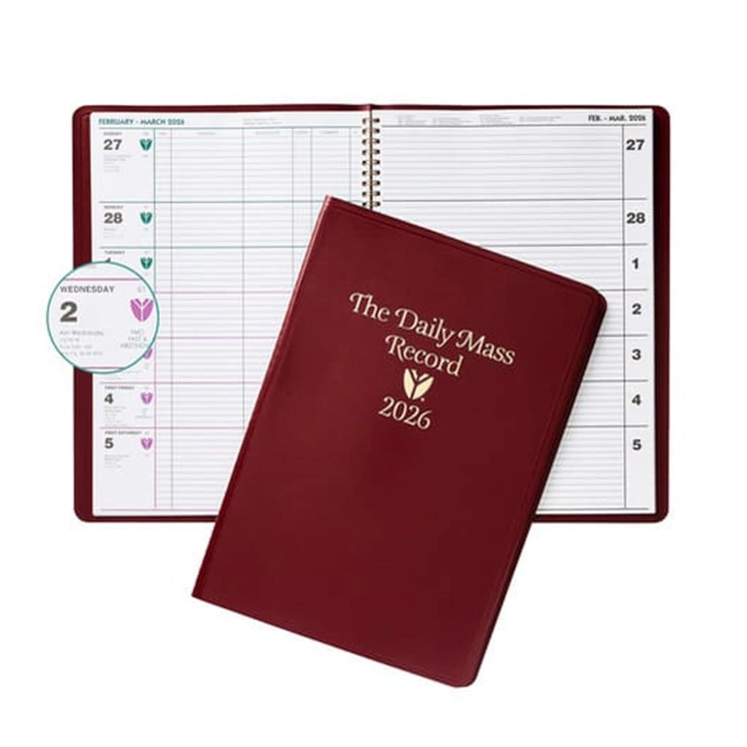 Includes more than 14 months, from the first Sunday of Advent through January of the following year, with one 91/2″ x 13″ page per month, full liturgical information for each day, plus generous space to write appointments or notes: pages for parish statistics and specified/unspecified Masses.